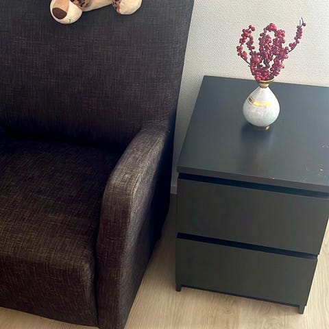 Ihan kelpo yöpöytä. Alkuperäinen muovivedin vaihdettu metalliseen. Vain nouto
