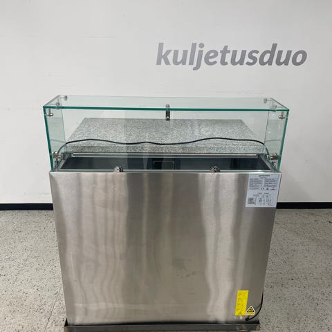 7 vetolaatikkoa, 3kpl 1/1 gn:n kylmäallas lasisuojalla. edessä kiinteä taso tarjottimelle yms.