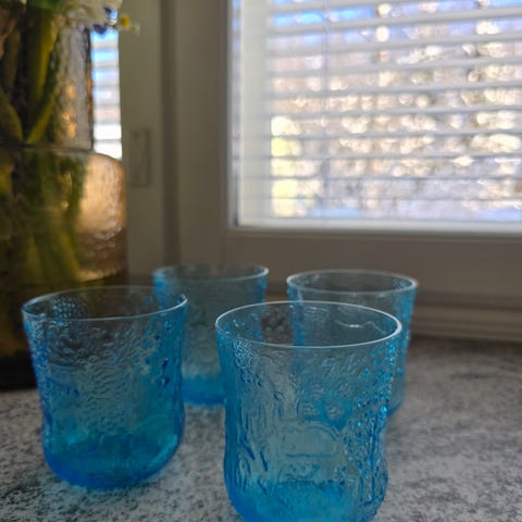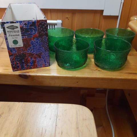 Neljä kappaletta hyvässä kunnossa olevia Nuutajärvemn vaaleansinisiä Fauna kulhoja.