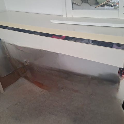 kaapin perälle jäänyt malm pöytä, hyvässä kunnossa kaikki tärkeä ruuvit tallessa, seinän kiinnitys kappale puuttuu & ruuvi siihen.