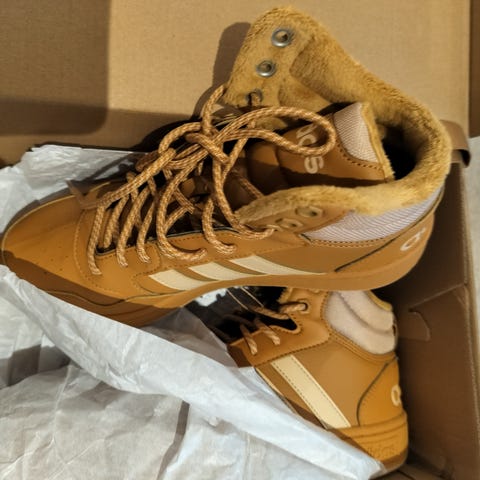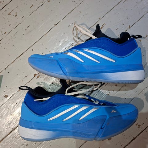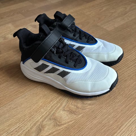 Adidas juoksu/koripallo kengät. Kiki 43,5. Kengissä on musta päällinen, kameleontti väri välipohja ja sivupaneelit sekä oranssit nauhat. Päällinen on osittain verkkokangasta, joka lisää hengittävyyttä. Pohjassa on vaimennettu välipohja ja kuvioitu ulkopohja. Kantapäässä on Adidas-logo. Soveltuu juoksuun ja muuhun liikuntaan.