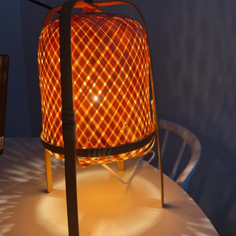 IKEA rottinkinen riippuvalaisin luonnonvärisenä. Varjostin on punottua rottinkia, joka päästää valon läpi rimojen välistä ja luo kuvioitua valoa ympärilleen. Sopii käytettäväksi esimerkiksi olohuoneessa, ruokapöydän yläpuolella tai makuuhuoneessa yleisvalaisimena. Valaisimessa on johto ja koristelamppu mukana.