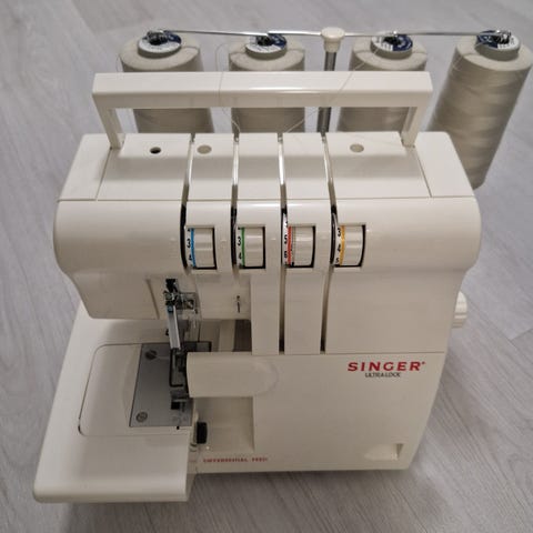 Koneessa on kolmen langan saumausmahdollisuus ja erilliset säätimet langankireyksille. Etuosassa on ompelutaso helpottamaan hihan- ja lahkeensuujen ompelua.