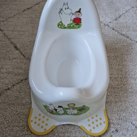 Muumi lasten potta. Valkoinen potta, jossa Muumi-aiheiset kuvitukset sivuilla ja selkänojassa. Potassa on korotettu selkänoja ja roiskeita vähentävä etuosa. Pohjassa on liukuestealueet, jotka auttavat pitämään potan paikallaan käytön aikana. Soveltuu pienten lasten kuivaksi opetteluun kotona tai esimerkiksi mummolassa käytettäväksi lisäpottana.