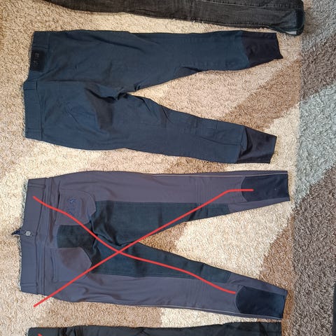 Muuten hyvät, mutta paikat pahoin kuluneet (lähti pesussa).