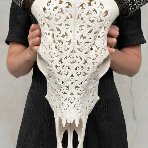 Tämä veistetty lehmän pääkallo on upea sisustuselementti, joka elävöittää minkä tahansa kodin tai ravintolan. Se ei ole vain henkinen ja kulttuurinen taideteos; se kertoo myös tarinan indonesialaisten alkuperäiskäsityöläisten perinteestä, jotka säilyttävät paikallisen käytännön käyttää jokainen osa eläimestä luodakseen ikuisen taideteoksen. Tämä pääkallo on käsityönä tehty Indonesiassa, missä kaiverrustaito eläinten pääkalloihin siirtyy isältä pojalle. He ovat hallitseet tätä ovelaa tekniikkaa ja tarvitsevat noin 5–6 päivää yksityiskohtaisten kaiverrusten, kuten tämän mallin, tekemiseen. Sarvet on myös veistetty boheemityylisesti.Engraved on kaunis saniaisaihe.Arvioidut mitatPituus: 58 cmLeveys: 63 cmHUOM:Olemme lisänneet kuvia käsityöläisistämme työssään antaaksemme kuvan siitä, millainen prosessi on kaiverratetun pään luominen.Paino, joka mainitaan, sisältää pakkausmateriaalin.VastuuvapauslausekePäähän on kiinnitetty kiristysnarusta, jotta se voidaan kiinnittää seinälle.- Sarvet irrotetaan kuljetusta varten, ja ne on helppo kiinnittää takaisin. Sarvet ovat aina pakattuna laatikon pohjalle, kallon alle. Varmista, että poistat sarvet ennen pakkauksen hävittämistä.- Koska kyseessä on luonnollinen kallo, siinä saattaa olla joitakin luonnollisia pieniä halkeamia, uurteita tai puuttuvia hampaita. Tämä on normaalia. Katso kuvat viitteeksi.- Kallomme puhdistetaan ammattilaisvoimin, mutta joskus hampaissa voi esiintyä pieniä värimuutoksia. Tämä on luonnollista ja normaalia, eikä siihen voida paljoa vaikuttaa. Katso kuvat ohjeiden tueksi.LähetysKohde lähetetään seurantanumerolla DHL Parcelin, DPD:n tai postNlin kautta. Seuranta päivittyy Catawiki-luettelossasi, kun pakettisi on jätetty postiin.Ole hyvä ja tarkista säännöllisesti välttääksesi pakettisi palautumisen meille, jolloin ostaja vastaa toisen lähetyksen toimituskuluista.Seurantaan Espanjaan ja Portugaliin käytä tätä linkkiä ja lisää Catawiki-erästäsi saatu seurantanumero.https://clientesparcel.dhl.es/LiveTracking/HomeME EMME YHDISTÄ TOIMITUKSIA!!!Jos sinulla on kysyttävää paketistasi, ota meihin yhteyttä Catawiki-viestipalvelun kautta. Pyrimme vastaamaan kolmessa työpäivässä.