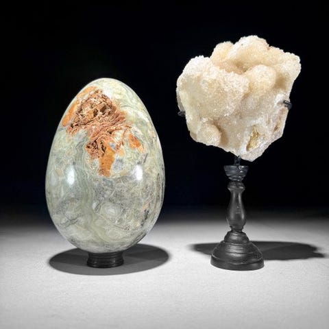 Uskomaton pari Crystal Cube Calcite Cluster ja kiillotettu sydämen muotoinen zebra-kristalli omalla räätälöidyllä jalustalla.Kalkkikivikuutio viittaa luonnostaan muodostuneeseen tai keinotekoisesti muotoiltuun kalkkikivikiteeseen, joka esittää kuutiomuotoa. Kalkkikivi kiteytyy tyypillisesti trigonaalisen kiteisjärjestelmän mukaisesti muodostaen rhomboedrisiä tai scalenoedrisiä kiteitä. Kuitenkin tietyissä olosuhteissa kalkkikivi voi muodostaa kuutiomaisia kiteitä. Nämä kuutiokiteet ovat suhteellisen harvinaisia verrattuna muihin kalkkikiven muotoihin. Kalkkikivikuutioiden piirteisiin kuuluu niiden geometrinen muoto, joka muistuttaa kuutiota, jossa on kuusi neliömäistä pintaa. Kuutioiden reunat ja kulmat ovat usein hyvin määriteltyjä, mikä luo symmetrisen ja esteettisesti miellyttävän kiteen. Kalkkikivikuutioiden muodostumiseen vaikuttavat tekijät, kuten lämpötila, paine ja ympäristön kemiallinen koostumus. Kuutioiset kalkkikivikiteet löytyvät yleensä alueilta, joissa on ollut riittävästi tilaa kiteen kasvulle ilman muiden mineraalien häiriöitä.Kalkkikuutiot ovat kiehtovia esimerkkejä mineraalien erilaisista kristallimuodoista, jotka esittelevät luonnollista kauneutta ja sisäistä symmetriaa, jotka kuuluvat kiteisiin rakenteisiin.Zebra-kristalli, joka tunnetaan myös Zebra Stone -pallona, viittaa Zebra Stone -kivestä valmistettuun sydämenmuotoiseen esineeseen, joka on ainutlaatuinen sedimentaarinen kivilaji.Zebra Stone koostuu vuorottelevista kerroksista valkoista kvartsia ja tummia mineraaleja, kuten hematiteä tai goethiteä. Näiden kontrastisten värien luomat vaikuttavat zebra-tyyliset kuviot antavat kivelle sen nimen.ARVIOIDUT MITAT - SISÄLTÄEN JALUSTAN:# Cluster --> Korkeus: 20,5 cm, Leveys: 13 cm, Pituus: 6 cm# Sydänmuoto --> Korkeus: 13 cm, Leveys: 11,5 cm, Pituus: 6 cmHUOM:- Huomaa, että näissä kuvissa yksi esineistä on otettu hämärässä studiossa; värit voivat vaihdella ympäristön mukaan.Mainittu paino sisältää pakkausmateriaalin.LähetyksetTuote lähetetään seurantanumerolla DHL Parcelin, DPD:n tai postNl:n kautta. Seuranta päivittyy Catawiki-luettelossasi, kun pakettisi on jätetty postiin.Ole hyvä ja tarkista säännöllisesti välttääksesi pakettisi palautumisen meille, jolloin ostaja vastaa toisen lähetyksen toimituskuluista.Seurantaan Espanjaan ja Portugaliin käytä tätä linkkiä ja lisää Catawiki-erästäsi saatu seurantanumero.https://clientesparcel.dhl.es/LiveTracking/HomeME EMME YHDISTÄ TOIMITUKSIA!!!Jos sinulla on kysyttävää paketistasi, ota meihin yhteyttä Catawiki-viestipalvelun kautta. Pyrimme vastaamaan kolmessa työpäivässä.