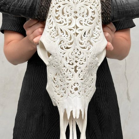 Suuri käsin kaiverrettu biisonin pääkallo, jonka ovat kaivertaneet taiteilijat, jotka ovat siirtäneet kaiverruksen muinaisen taidon isältä pojalle. Kallo on kokonaan käsin huolellisesti kaiverrettu. Se on epätavallinen, koristeellinen kappale. Kalloon on kaiverrettu kaunis perinteinen balilainen motiivi.Arvioidut mitatPituus: 59 cmLeveys: 82 cmHUOM:Olemme lisänneet kuvia käsityöläisistämme työssään antaaksemme kuvan siitä, millainen prosessi on kaiverratetun pään luominen.Paino, joka mainitaan, sisältää pakkausmateriaalin.VastuunrajoituksetKalloon on kiinnitetty kiristysnaru, jotta sen voi asentaa seinälle.- Sarvet irrotetaan kuljetuksen vuoksi, ja ne on helppo kiinnittää takaisin. Sarvet pakataan aina laatikon pohjalle, kallon alle. Varmistuthan, että poistat sarvet ennen pakkauksen hävittämistä.Koska kyseessä on luonnollinen kallo, siinä saattaa olla joitakin luonnollisia pieniä halkeamia, uurteita tai puuttuvia hampaita. Tämä on normaalia. Katso kuvia.- Kallomme puhdistetaan ammattilaisvoimin, mutta joskus hampaissa voi esiintyä pieniä värjäytymiä. Tämä on luonnollista ja normaalia, eikä siihen voida paljoa vaikuttaa. Katso kuvat.LähetysKohde lähetetään seurantanumerolla DHL Parcelin, DPD:n tai postNlin kautta. Seuranta päivittyy Catawiki-luettelossasi, kun pakettisi on jätetty postiin.Ole hyvä ja tarkista säännöllisesti välttääksesi pakettisi palautumisen meille, jolloin ostaja vastaa toisen lähetyksen toimituskuluista.Seurantaan Espanjaan ja Portugaliin käytä tätä linkkiä ja lisää Catawiki-erästäsi saatu seurantanumero.https://clientesparcel.dhl.es/LiveTracking/HomeME EMME YHDISTÄ TOIMITUKSIA!!!Jos sinulla on kysyttävää paketistasi, ota meihin yhteyttä Catawiki-viestipalvelun kautta. Pyrimme vastaamaan kolmessa työpäivässä.