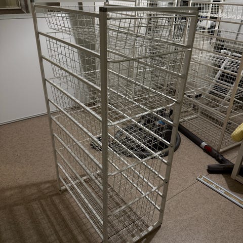 Erilaisia Elfa-korisysteemejä, pääasiassa 174cm korkeita, leveys 45 ja 55cm (syvyys 54cm). Jossakin jalat ja joissakin ei, se vaikuttaa korkeuteen parisen sentin verran.