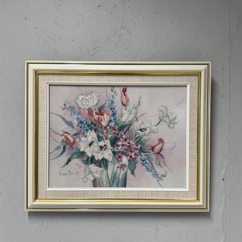 Taulu ”Kukat ruukussa” teos. Signeeraus Meri Savela -99 (tuntematon).