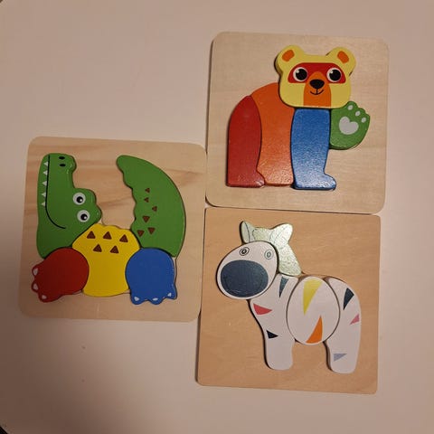 Puiset palapelit, yhteensä 4 kappaletta. Materiaalina on puu, ja palat ovat paksuja ja tukevia, sopien erityisesti pienemmille lapsille. Uusi avaamaton pakkaus.