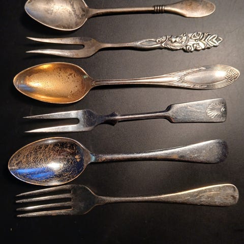 1920-30-luvulta olevat kookkaat (n.22 cm) ruokalusikat. Kaiverrukset Annikki/3 ja Paavo/3. Hyväkuntoiset, ei yritetty puhdistaa, 2 lusikkaa säilynyt 100 vuotta kirkkaana. 6 lusikkaa painaa 440g ja hinta yhteensä 8 euroa.