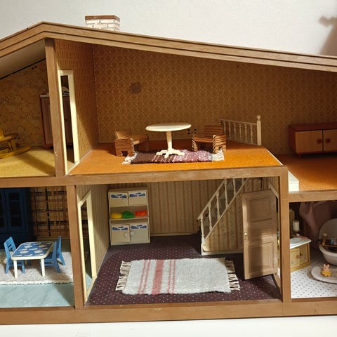 Lundby nukkekoti, jossa useita huoneita ja värikkäät kuviolliset tapetit. Osa seinistä käännettävissä, jolloin saa uutta ilmettä sisustukseen. Yhdessä huoneessa on "tapetti" repeytynyt. Tarralla korjattavissa.