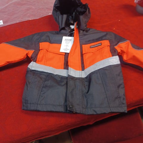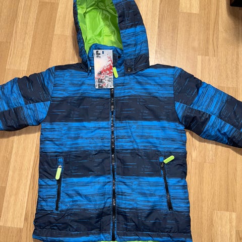 Lämmin, kaunis , lasten takki. Koko 110 cm, . Takki on sininen, jossa on kuviollinen pinta ja oranssi vuori. Materiaali on polyesteriä. Mallissa on huppu, vetoketjukiinnitys ja etutaskut. Hihassa on heijastinraita, joka parantaa näkyvyyttä. Soveltuu arki- ja ulkoilukäyttöön lapselle 110 -120 cm pituusluokassa.
