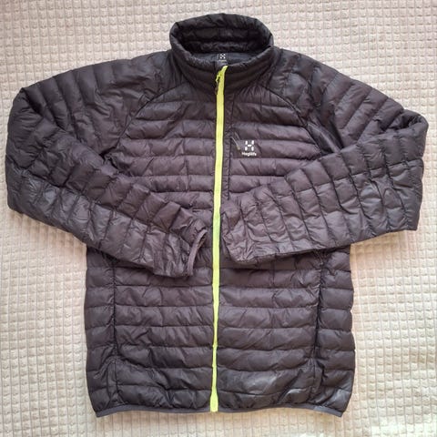 Haglöfs kevyttoppatakki miehille, koko L. Väri sininen. Takissa on täyspitkä vetoketju edessä ja sivuilla vetoketjulliset taskut. Kevyesti topattu, tikattu pinta.