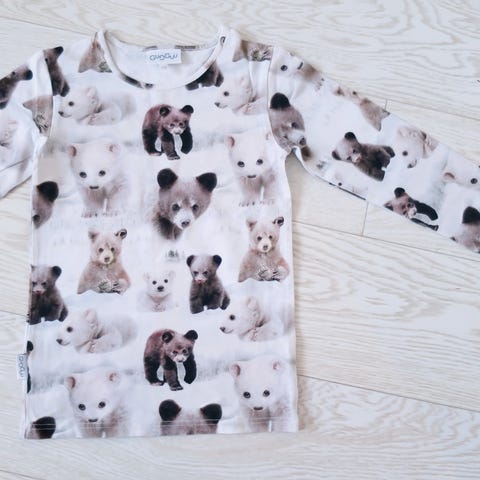 Gugguu ja Blaa paidat yhdessä. Kimalaispaidassa hentoa tahraa hihoissa. Blaa 122/128 kokomerkintä mutta reilu koko.