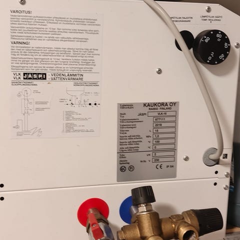 Jäspi Tehowatti 21 sähkökattila. Valmistaja Kaukora Oy, Raisio, Finland. Malli on suunniteltu vesikiertoiseen lämmitysjärjestelmään ja käyttöveden lämmitykseen. Tyyppikilven mukaan teho on 3/21 kW ja laite toimii 230/400 V jännitteellä. Etupaneelissa on digitaalinen näyttö ja painikkeet asetusten säätöön sekä säätimet lämpötilan ohjaukseen. Soveltuu asennettavaksi sisätiloihin IP21-suojausluokan mukaisesti. Kattila liitetään talon lämmitysverkkoon ja sähköverkkoon valmistajan ohjeiden mukaisesti.Lämmitys puoli on ollut 1v käytössä.varaaja ei ole ollut käytössä ollenkaan.