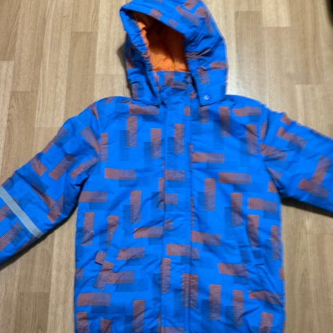 takki, koko 110. Takki on sininen, raidallinen ja valmistettu polyesteristä. Edessä vetoketju ja kaksi vetoketjullista taskua. Irrottamaton huppu, jonka sisäpuoli on vihreä. Sopii arki- ja ulkokäyttöön pojille noin 110 cm pituudelle.
