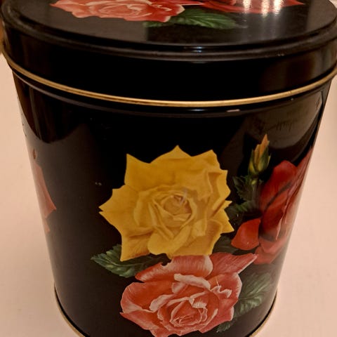 Valkoisella pohjalla olevia ruusuja eri sävyisinä peltisessä säilytyspurkissa. Sisältä kullanvärinen. Korkeus 14cm, halkaisija 9cm.