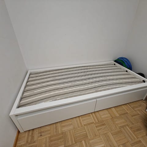 IKEA sänky sälepohjalla. Sängyssä on valkoinen runko ja joustava sälepohja, joka koostuu useista toisiinsa kiinnitetyistä säleistä. Rungossa on korkea pääty ja matalampi jalkopääty. Sängyn sivuilla on umpinainen laita, ja toisella sivulla on säilytystilaa vetolaatikoilla tai avohyllyllä rungon alla. Sopii käytettäväksi yhden hengen sänkynä erillisen patjan kanssa. Materiaalina on puu- ja/tai puukuitupohjainen levy sekä puusäleet.