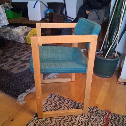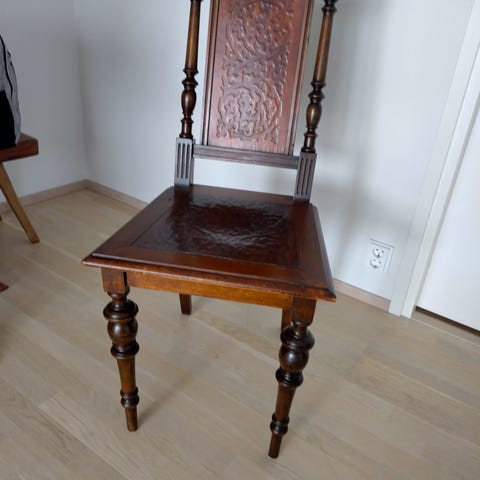 Täyspuinen tuoli, 4kpl, jossa valkoinen maalattu runko ja pystyrimoista koostuva selkänoja. Istuimessa ja selkänojassa on vihreäsävyinen, monivärisin raidoilla ja kuvioin koristeltu kangasverhoilu. Tuolin kokonaiskorkeus on noin 86–87 cm, istuinkorkeus noin 49–50 cm. Sopii esimerkiksi ruokapöydän tuoliksi.