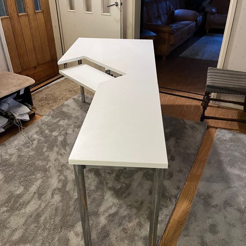 Annetaan mittatilaustyönä teetetty tietokonepöytä. Jalkojen kiinnitysruuvit tulevat mukana. Hiirimaton saa myös mukaan halutessa.