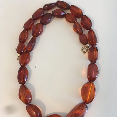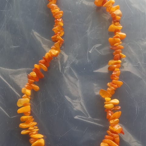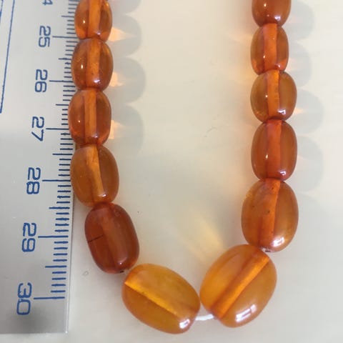 Pyöreät meripihkahelmet jotka suurenevat alaspäin. Pituus avattuna 44cm ja suurimman helmen koko 2x1,5cm
