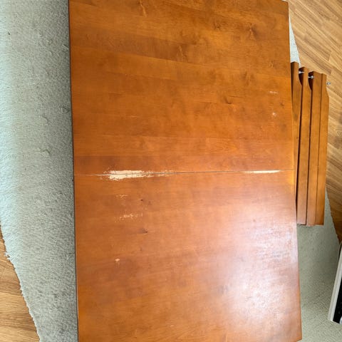 Annetaan hyvään kotiin puinen pöytä ja neljä tuolia. Yksi tuoleista vaatii hieman fiksausta. Irrotettavat ja pestävät tuolin päälliset.