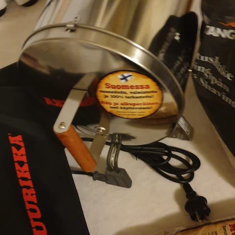 Muurikka sähkösavustin teräsrunkoisena. Tynnyrimallinen savustin, jossa sähkövastus pohjassa ja irrotettava ritilä. Puukahvat helpottavat kannen ja savustimen käsittelyä. Mukana suojapäällinen, jossa Muurikka-logo. Soveltuu ruoan, kuten kalan ja lihan, savustamiseen parvekkeella tai pihalla valmistajan ohjeiden mukaisesti. Kauppaan kuuluu alla oleva pöytä joka terästä ja pulveri maalattu mustaksi 50x79x90