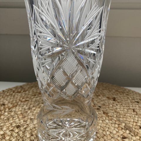 Myydään.kristallimaljakko. hiottu koristelu. Painava rakenne, pysyy hyvin.pystyssä. Mitat: korkeus 21,5 cm, suuaukon halkaisija 6,7 cm, jalan halkaisija 6,5 cm.