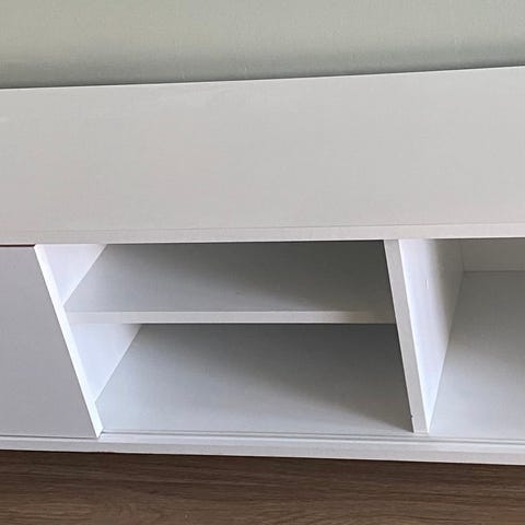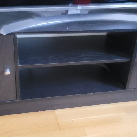 Annetaan kuvan TV-taso uuden tieltä pois. Muutamia naarmuja puutason pinnoilta nähtävissä, muttei meidän käytön aikana pistänyt silmään. Helppo siirrellä pyörien avulla.
