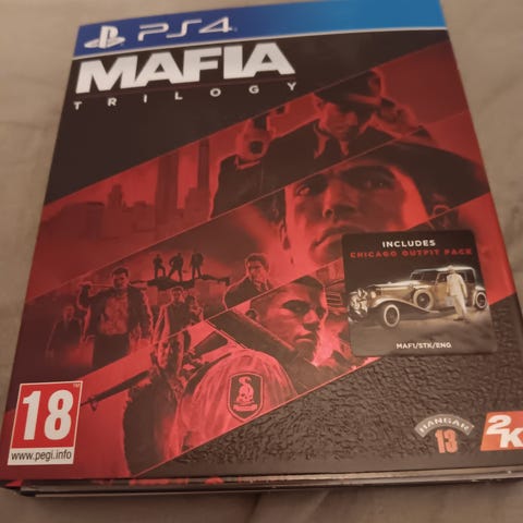 Playstation 4 Mafia Trilogy -pelikokoelma. Pakkaus sisältää kolme Mafia-pelisarjan osaa PS4-konsolille. Fyysiset levyt alkuperäisissä koteloissa.