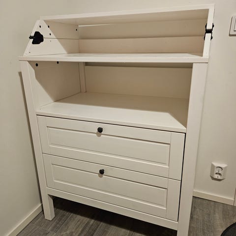 Puusepän valmistama hoitopöytä. Todella tukeva ja siistissä kunnossa. Korkeus tason korkeudelle 94cm, reunojen kanssa korkeus 98,5cm. Kokonaisleveys 65cm, kokonaissyvyys 80cm. Hoitotason koko 59cm x 77cm