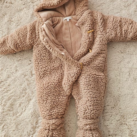 Pehmeä teddy-haalari. Hyvä käytetty kunto, jalkapohjissa jonkun verran kulumaa (kuva).