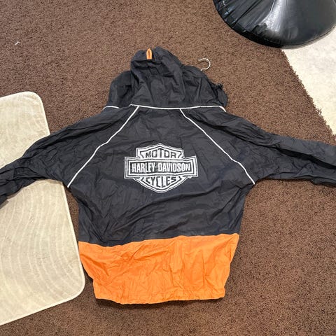 Harley-Davidson Riding Gear ajotakki, koko L. Musta takki, jossa suuret Harley-Davidson-logot ja liekkikuvioinnit selässä ja hihoissa. Takissa on verkkovuori ja se on valmistettu synteettisestä materiaalista (polyesterisekoitus). Erittäin siisti