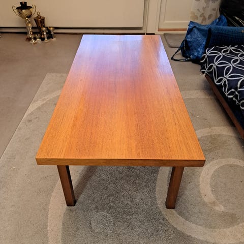 Huvila niminen tukevarakenteinen sohvapöytä, tilava laatikko sivussa. Pituus/100cm × leveys/60cm × korkeus/48cm.