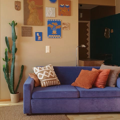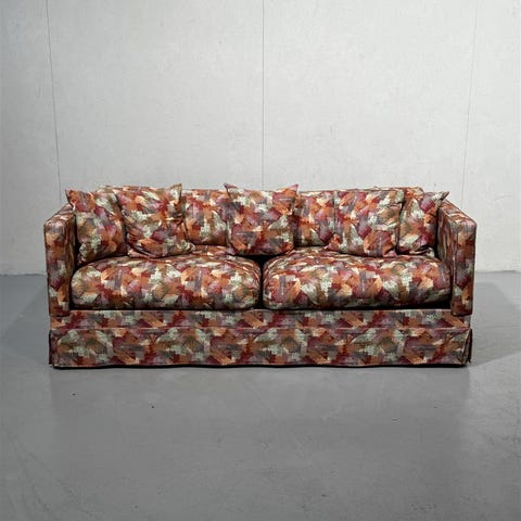 Kaksipaikkainen tukeva vihreä kangassohva, jossa on irrotettavat tyynyt ja vetoketjulliset päälliset. Sohvan verhoilu on vihreä ja kankaassa sinertäviä säikeitä tuomaan kontrastia kankaan väriin. Sohva edustaa modernia tyyliä, joka korostaa yksinkertaisuutta ja toimivuutta. Tyyli on suosittu nykyaikaisessa sisustuksessa.