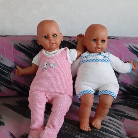 Uudenveroinen vauvanukke. Noin 40cm pitkä. Mukana mekko, 2 haalaria ja molempiin haalareihin samasta kankaasta hattu.