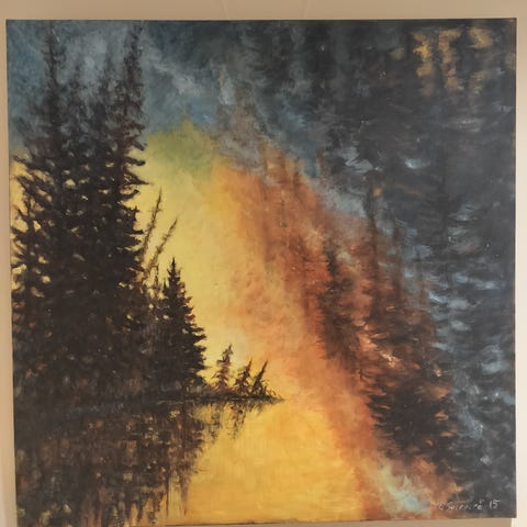Reijo Hakalan Kehystetty maisemamaalaus, jossa järvimaisema, ja rantakoivut puunsävyisessä kehyksessä. Taulussa on taiteilijan signeeraus vuodelta 84.