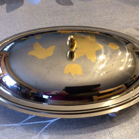 Uusi, made in Italy. Inox 18/10. Kuvioissa 24kt kultaus. Halkaisija 26cm. Korkeus 4,5cm. Postikulut lisätään hintaan tai nouto Merikarvialta.