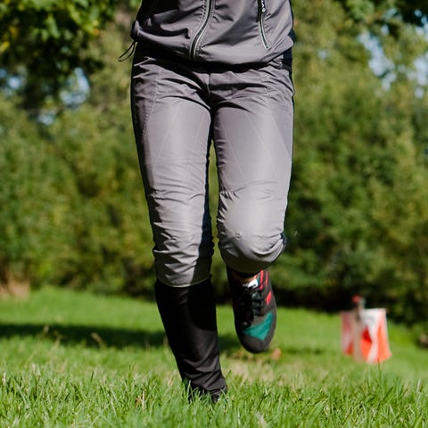 Miesten ja naisten juoksu- ja treenihousut, jotka soveltuvat moneen urheiluun. Takaosa tuulettavaa materiaalia. Sivuilla vetoketjutaskut sekä takana vetoketjutasku. Mukailtu kuminauhavyötärö, säädöt lahkeissa. Miesmallilla (185 cm) juoksuhousut koko L. Naismallilla (165 cm) juoksuhousut koko M.