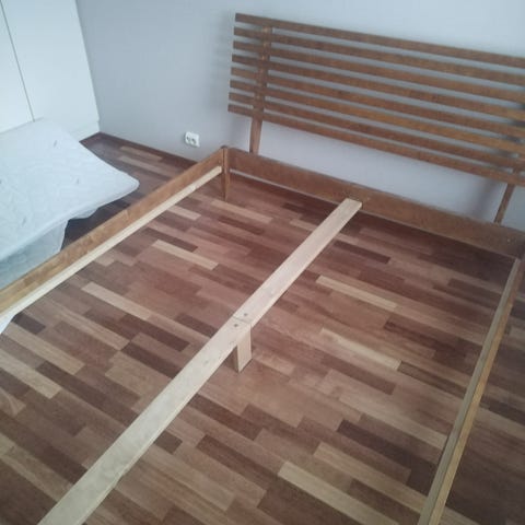 Parisänky, tarkoitettu 160*200 cm patjalle. Täysin puuta, ruskea. Oli tukeva ja ei hytkynyt, ennen kuin purin osiin. Hinta on edullinen, koska laitojen kiinnitysvastakappaleet (mihin ruuvit tulee päätyjen läpi) on uponneet puun sisään. Ei ne sieltä mihinkään liiku, mutta muistutuksena ettei kyseessä ole uusi ja virheetön tuote. Mikäli nämä nyt jostain syystä irtoaisi, niin joku joka on kätevä käsistään osaa kyllä korjata (puukittiä ja uudet reiät). Jalkopäässä erityisesti on hieman naarmua. Keskirungossa on kaksi tukijalkaa ja nämä eivät ole vääntyneet mihinkään. Sisältää sälepohjan ja ruuvit.
