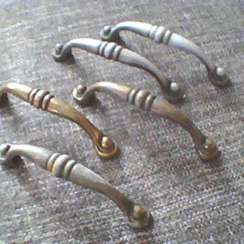 Metalliset kaapin- tai laatikonvetimet ruuveineen. Useita samanmallisia vetimiä, kaareva muoto ja kiinnitys kahdella ruuvilla. Sopivat esimerkiksi keittiökaappeihin, lipastoihin tai muihin kalusteisiin, joissa on tarve vaihtaa tai lisätä vetimiä. Kuvassa on likaiset vähän, ovat siistissä kunnossa.