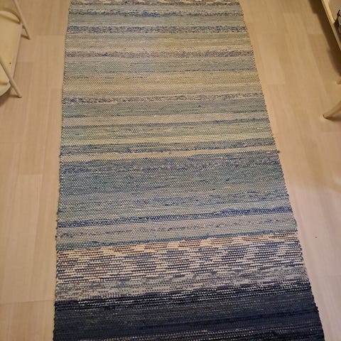 Puhdas, siisti matto, ollut muovin sisällä säilytyksessä, ei varmaan käytetty ollenkaan pesun jälkeen. Väritys tummansininen, valkoinen, lila. Koko noin 203cm x 134cm Nouto Tohlopista.