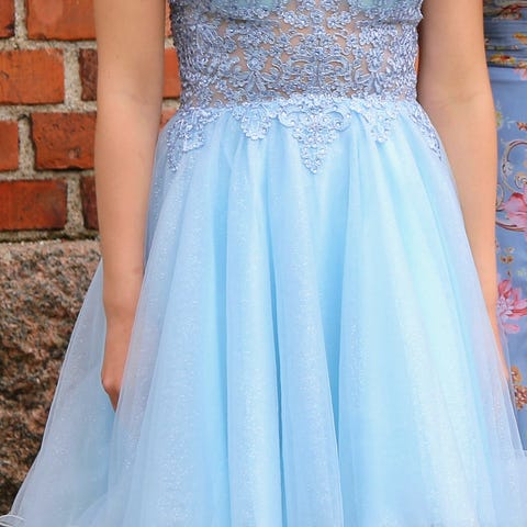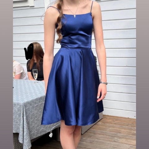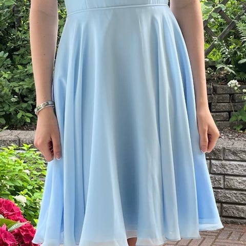 Zazabella sininen rippi-/ juhlamekko, koko 34. Kerran käytetty, kuin uusi. Yläosa sekä helma on koristeltu pitsi- ja helmiyksityiskohdin, ja selässä on nauhoilla säädettävä nyöritys.
