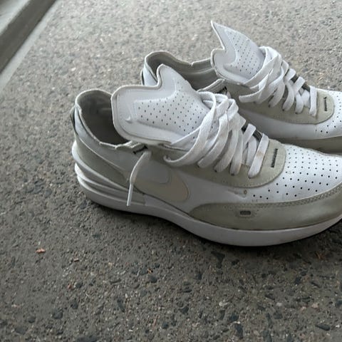 Nike Air Force 1 tennarit, koko 44. Väri valkoinen. Materiaalina päällisosassa synteettinen nahka ja tekstiili, kumipohja. Nauhakiinnitys ja rei’itetty kärki hengittävyyden parantamiseksi. Klassinen Air Force 1 -malli arkikäyttöön.