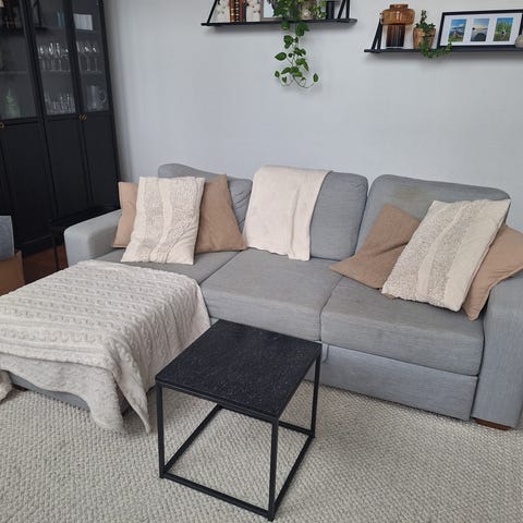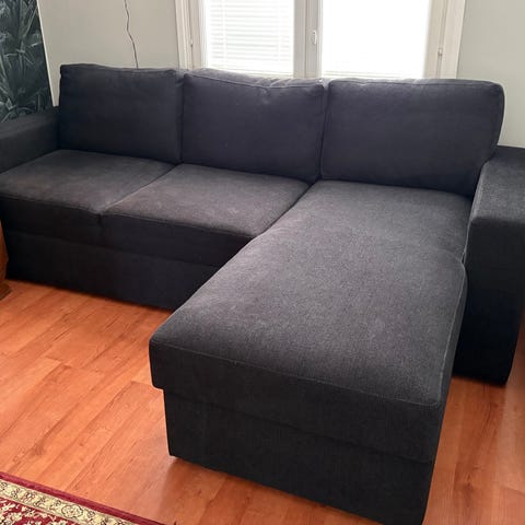 Harmaakankainen divaanivuodesohva. Divaani osassa säilytystilaa. Leveys n 250 ja divaani osan pituus noin 155. Kankaassa pieniä tahroja sekä pieni maalitahra. Tästä vaikka mökille sohva! Nouto perjantaina, 20.2. 40€/tarjous