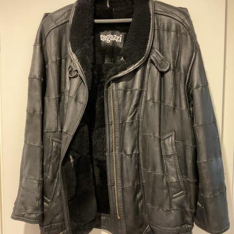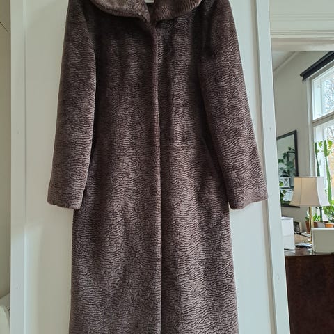 Hyväkuntoinen turkisvuorinen takki, jossa myös turkisreunus. Koko 36/38.