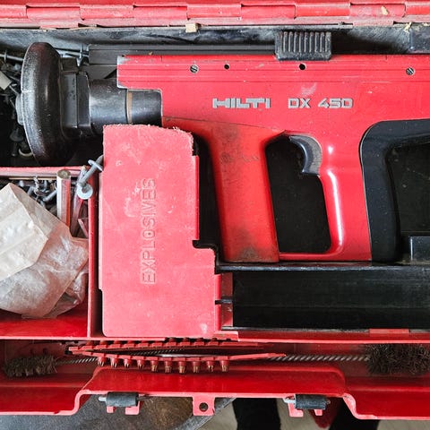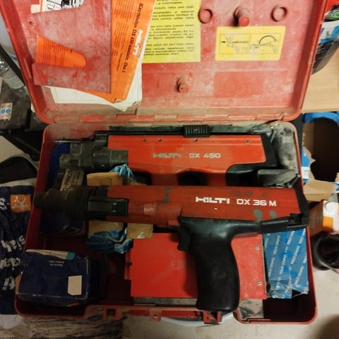 Hilti DX 450 panosnaulain. Punainen runko, suunniteltu ruutipanoksilla tapahtuvaan kiinnitykseen esimerkiksi betoniin ja teräkseen. Kuvat osoittavat mukana tulevia varaosia sekä 4 kpl Peramark 6,8/11 M -ruutipanoksia, jotka on merkitty yhteensopiviksi Hilti DX 450 -mallin kanssa. Soveltuu ammattimaiseen ja vaativaan kiinnitystyöhön rakennus- ja asennuskohteissa käyttäjän ohjeiden ja turvallisuusmääräysten mukaisesti. Mukana myös 5 pakettia nauloja