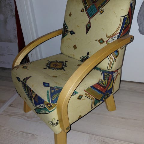 IKEA lasten nojatuoli. Valkoinen muovinen istuinosa, jossa irrotettava kuomu ja pehmusteet. Pehmusteissa on harmaa pohjaväri ja värikkäitä auto- ja ajoneuvokuvioita. Soveltuu lapsen istuma- ja lepohetkiin sisäkäytössä.
